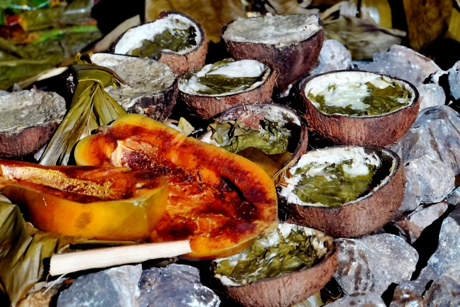 Watch as CandyMann dramatically unveils the earth oven by removing the encompassing banana leaves at 7 pm sharp, revealing perfectly cooked traditional food whilst Tisa shares fascinating insights about this ancient cooking method.